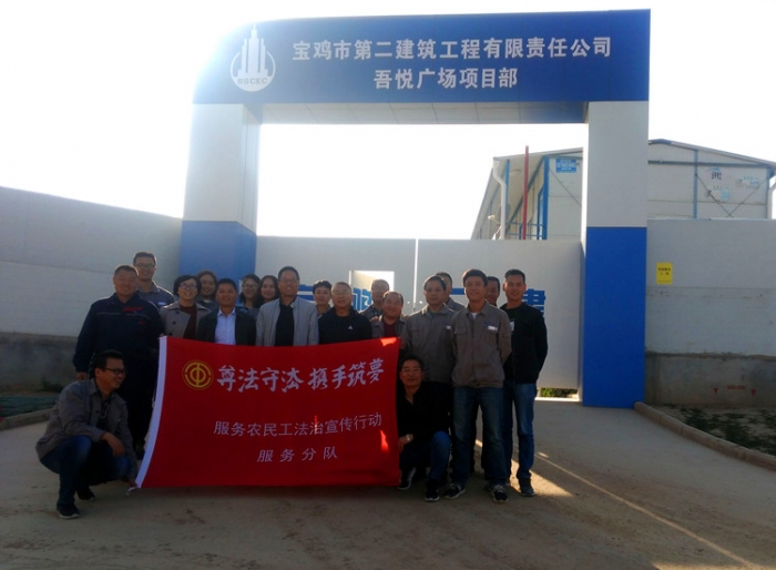 2018年10月10日下午,寶雞文理學(xué)院服務(wù)農(nóng)民工法治宣傳服務(wù)分隊(duì)來(lái)到公司吾悅廣場(chǎng)項(xiàng)目施工現(xiàn)場(chǎng),舉辦了一場(chǎng)“尊法守法·攜手筑夢(mèng)”法律知識(shí)公益講座。第三十項(xiàng)目部、第三十八項(xiàng)目部的三十余名現(xiàn)場(chǎng)施工人員參加了活動(dòng)。