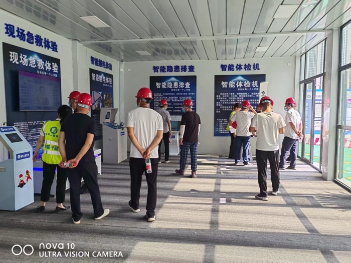 碧桂園鳳凰城三期項(xiàng)目由六棟高層住宅樓、配套商業(yè)及地下車庫組成,總建筑面積為 115340㎡,主體施工采用附著式全鋼爬架+新型鋁合金模板等施工工藝。該項(xiàng)目工序穿插作業(yè)多、群塔作業(yè)等安全管理協(xié)調(diào)難度大,項(xiàng)目積極采用群塔防碰撞系統(tǒng)、塔吊智能監(jiān)測系統(tǒng)、塔吊防松動(dòng)預(yù)警螺母及塔吊吊鉤可視化系統(tǒng)。觀摩會(huì)現(xiàn)場中,通過智慧工地云平臺(tái)、安全管理指揮中心、VR安全教育體驗(yàn)館等全面展示了項(xiàng)目施工現(xiàn)場智慧工地和文明施工管理現(xiàn)代化模式。